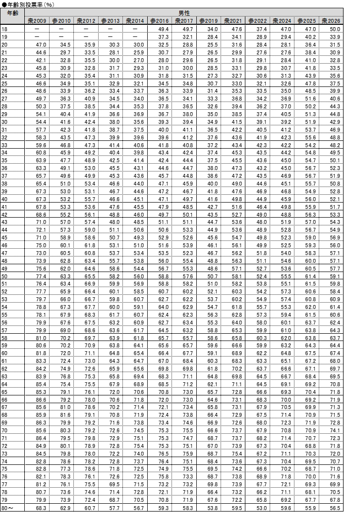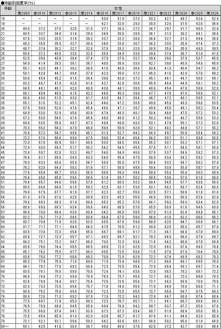 といった傾向は一貫しているように見えます。世代を超えて同じ傾向が見られるということは、何か構造的な要因が背景にありそうです。おおよそ65歳頃に男性投票率と女性投票率の逆転が生じるのは、定年退職が関係しているのかもしれません。他方、それ以前の年齢でほぼ一貫して女性投票率>男性投票率となることや、そのギャップが最も大きいのが20代~30代前半である理由は、定かでありません。
