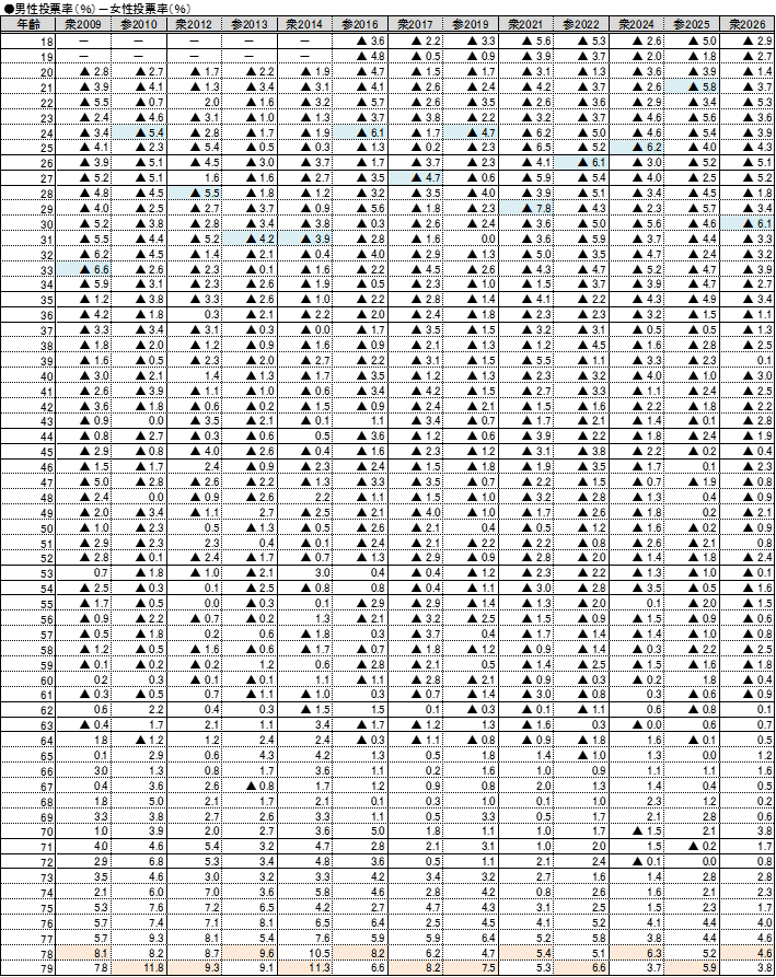 ①女性投票率>男性投票率のギャップが最も大きいのは20代~30代前半